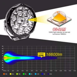 Navan’s 8.5″ LED driving lights provide high quality beam with low power consumption and significantly improve nighttime visibility. They are suitable for all types of vehicles: cars, off-road vehicles, ATVs, UTVs, trucks, boats… Each projector is composed of 15 Osram LED chips capable of emitting 16,600 lm for a total of 150W with a long lighting distance.