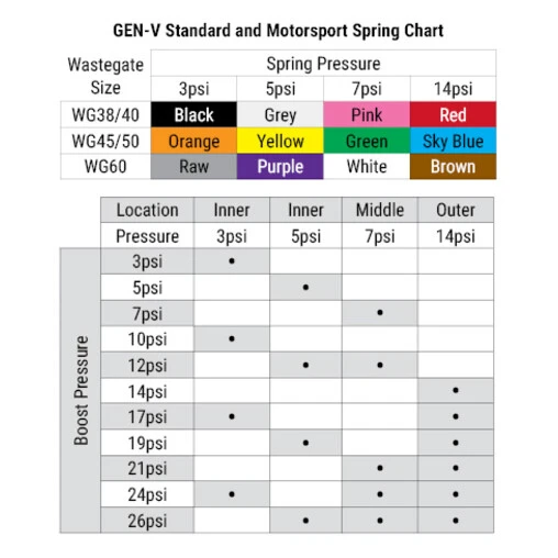 This product is available in black, blue, red or purple and is optionally equipped with a 7 psi (0.5 bar) or 14 psi (1 bar) spring. Its actuator allows for different combinations of spring calibrations (up to 3 housings: interior, intermediate and exterior) depending on the desired pressure. The wastegate is supplied with an assortment of springs: black 3 psi (0.2 bar), gray 5 psi (0.3 bar), pink 7 psi (0.5 bar) and red 14 psi (1 bar).